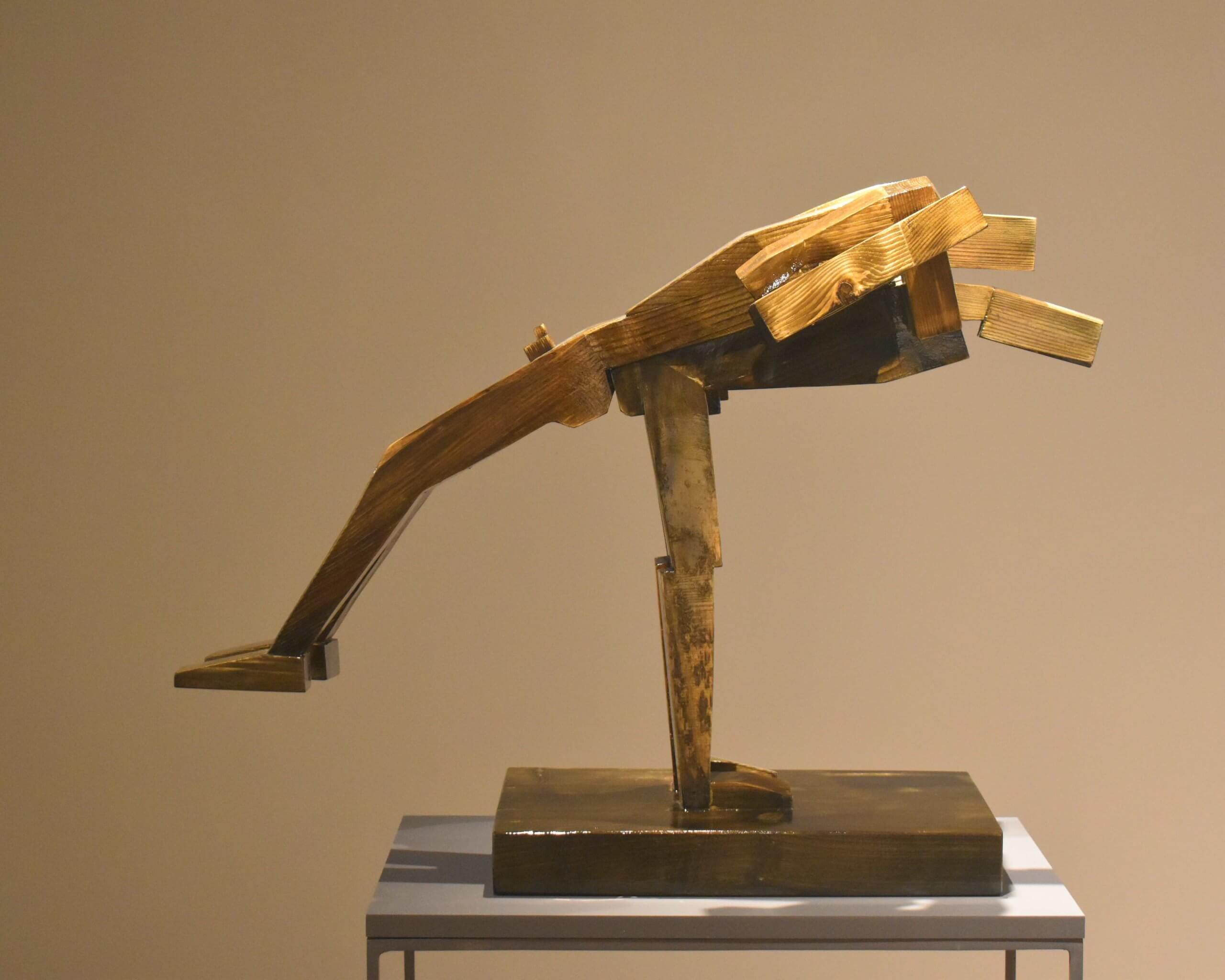 Za pomocą uproszczonych, geometrycznych form rzeźba bada, jak dwa ciała mogą stworzyć pojedynczą, wspólną równowagę. Lśniące, barwione drewno wzmacnia kontrast między napięciem a płynnością, przekształcając ulotny, atletyczny gest w studium harmonii i współzależności. „Partnerzy” odzwierciedlają istotę cyklu: równowagę osiąganą nie w izolacji, ale poprzez wzajemne wsparcie.